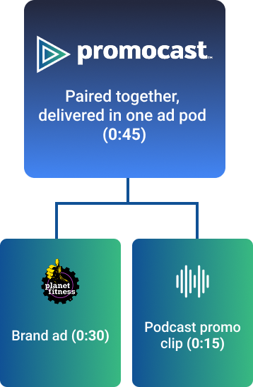 Promocast pairs snackable content from top podcasts with contextually-aligned brand ads, delivered in a single, high-impact unit.